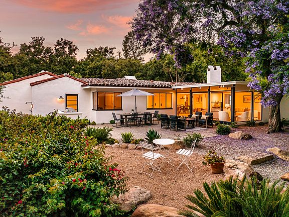 Conjuring dreams of an idyllic life lived at a slower pace, this romantic, renovated Spanish bungalow is an impeccable single level jewel. Set on just under an acre down a long gravel drive & surrounded by specimen oaks, the residence has been thoughtfully designed & executed for a modern lifestyle filled with style & quiet luxury. The primary suite has French doors to a private courtyard along w a luxurious bath & sumptuous closets; the show-stopping kitchen, dining & great room all merge together & are flooded w light & open to the outdoors. Three additional bds + a bonus room off the garage offer versatility to suit many lifestyles. Taking it outside, the landscape invites quiet reflection, boisterous entertaining and future expansion w multiple garden rooms & destinations.