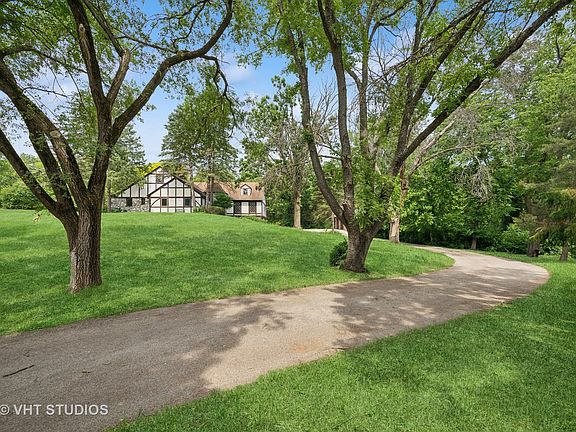Classic Tudor elegance meets rolling hill countryside on this 6.5 acre parcel in Barrington Hills. Upon entry, this 5 bedroom, 3.5 bath has a grand turret foyer that leads into a vaulted living room with exposed wood beams and a wood burning fireplace. Leading out to the deck and the stunning wooded views. The expansive dining room overlooks the front rolling hills and has a formal china closet. The island- style kitchen boasts abundant cabinetry, double oven and a lovely nook overlooking the lush woods. The en-suite primary with ample closet space hosts a spa like en-suite bath. The additional loft and lower level basement are perfect for recreation spaces and an at-home office. Bring your imagination and make this home in an idyllic setting all your own.