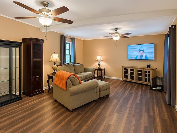 Inside, the main level features a cozy gas log fireplace in the living room, rich-toned flooring, and spacious windows that bring the outdoors in. The kitchen boasts abundant cabinetry, updated appliances, and warm finishes. Downstairs, a large finished family room in the basement offers the ideal flex space—perfect for movie nights, a playroom, or even a home office.