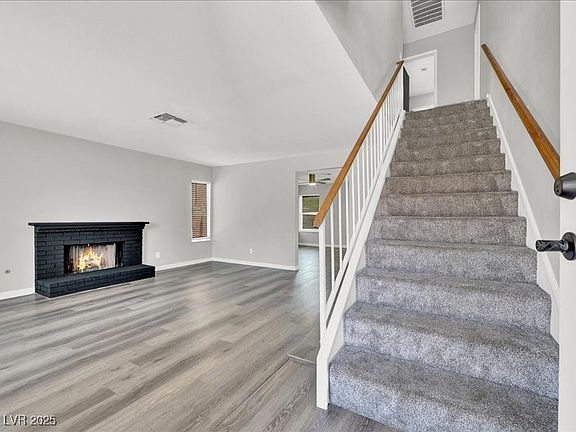 Make this beautifully remodeled home yours! This two-story gem features 3 bed/2.5 bath within 1,602 sqft of cozy living space, all just a short distance from the iconic Las Vegas Strip. Enjoy NO HOA fees! Upon entering, you'll find a welcoming living room complete with a gas fireplace, live-edge wood mantel and new laminate flooring throughout the main level. The expansive kitchen is a chef’s dream, showcasing brand-new stainless-steel appliances, a modern backsplash, upgraded granite countertops, and custom soft-close cabinets offering plenty of storage. Upstairs, you'll discover a serene retreat with a spacious primary bedroom and two additional bedrooms, all adorned with plush carpeting. The updated primary and secondary bathrooms include double sinks, new faucets, luxury vinyl flooring, and new shower tile. This cul-de-sac property sits on a spacious lot perfect for hosting! The backyard has a covered porch, and the front yard provides ample space with modern landscaping.