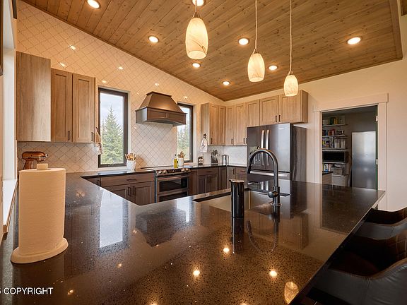 Modern elegance meets Alaskan charm in this stunning 4-bedroom, 3.5-bath home just 6 miles North of Homer. On 1.25 acres with breathtaking mountain and inlet views, this 2021-built luxury home offers exceptional craftsmanship and comfort.The sleek mono roof and two-story layout maximize natural light, while tall wood tongue-and-groove ceilings create a warm yet contemporary feel. The chef'skitchen features quartz counters, two-tone cabinetry, and a backsplash stretching to the ceiling. Dual primary suites one upstairs, one down feature elegant tile work, while two additional downstairs bedrooms add versatility. Cozy up by the wood stove or step onto the deck to take in the scenery. A big driveway, attached garage, detached two-car garage, and carport provide ample space for vehicles and toys. With upper and lower home entrances and easy access to recreational trails, this home is the perfect balance of adventure and tranquility. Every day feels like a postcard-worthy moment. Don't just dream it live it.