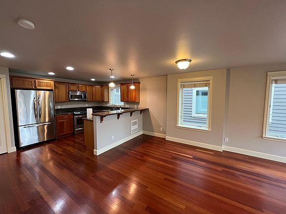 1520 sq ft Ballard townhome with 3 bedrooms, 3.25 bathrooms. A/C in two master bedrooms, as well as in the main living space. New carpet installed in February 2022. Two bedrooms on the top floor each have their own full bathroom, Air Conditioning, and vaulted ceilings. Washer and dryer also on the top floor. 3rd bedroom on the first floor has a bathroom with a shower. Main floor is open concept with cherry hardwoods throughout. Kitchen has stainless steel appliances and granite countertops. 4th bathroom is a 1/2 bath just off the kitchen. Tons of storage throughout the house, including a pantry on the main floor. Large paved backyard that is fully fenced and has access from the driveway and 3rd bedroom. Great location within walking distance of bars, restaurants, coffee shops, and stores in downtown Ballard. Townhome is a back unit, so does not have the street noise that a front unit would have. Single car garage is attached. Master bedroom has views of the Olympic Mountains. No association dues. First month's rent, security deposit, $195 non-refundable cleaning fee, and pet damage deposit (if applicable) due upon lease signing, with the option of paying the deposits and non-refundable move-in fees in installments - Additional terms provided prior to application
