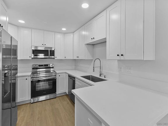 Fully remodeled 1 bed, 1 full bathroom and an additional powder room, with brand new appliances and a highly private top-floor location! Step into a modern, move-in ready home featuring an open layout, luxury vinyl plank flooring, recessed lighting, and fresh paint throughout. The upgraded kitchen includes brand new quartz countertops, shaker-style cabinets, and all-new stainless steel appliances—including a new refrigerator, dishwasher, electric range, and built-in microwave. The home offers a rare setup with three separate sink areas, a dedicated makeup vanity, and a beautifully updated shower. Enjoy indoor-outdoor living with a private balcony overlooking the pool and scenic mountain views. Located in a quiet, well-maintained community within walking distance to Fashion Valley Mall and minutes to Mission Bay, USD, downtown, and major freeways. Positioned next to the transformative Riverwalk development, this home offers exceptional convenience, impressive future upside, and incredible walkability—a standout opportunity for anyone seeking comfort, location, and long-term value in Mission Valley.