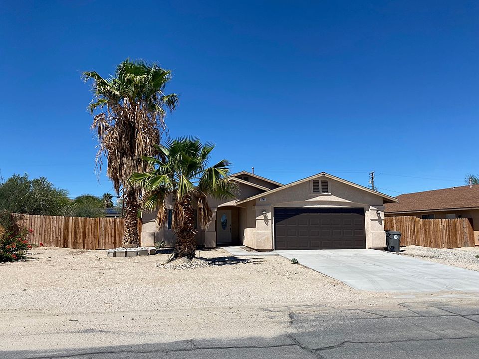 29 Palms property, built in 2013 with spacious 4 bedrooms and 2 baths. Upgraded granite countertops in open capatious kitchen. 2-car attached garage and a solar panel system to offset your electric bill. This lovely house features a fully fenced backyard, perfect for outdoor entertaining and privacy. The home is near restaurants, shopping, schools, 29 Palms Marine Base, Joshua Tree National Park, and more.