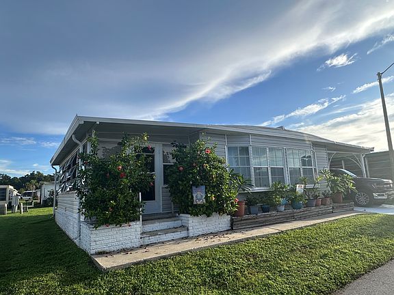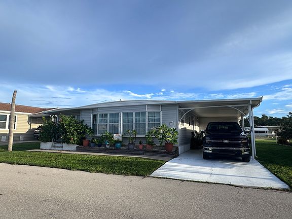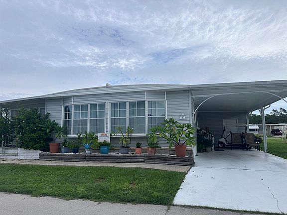 This cozy, warm spacious home is waiting for you! It was renovated in 2022 and has two bedrooms/two baths and comes partially furnished. It has an open concept with the kitchen flowing into the dining room & living room. It has a built in coffee station for that morning coffee and a breakfast bar with 4 stools. Some kitchenware will stay with the home such as dishes and some silverware. Ceilings all have been rebuilt with trusses and sisters on the bottom rails. All the ceilings have had new drywall and 4 1/4" crown molding. New toilets, faucet and vanities in the bathrooms. The bedrooms have large walking closets & the AC was newly installed in 2019. The AC control board was replaced in March 2025. A new programmable thermostat was recently installed in 2025. It has a new breaker box in 2024 and the Vapor Barrier is intact. Updated flooring and granite countertops in the kitchen. It has a built-in hutch in the dining room. The lanai has roll windows & carpet over a concrete floor. The shed that's under the carport holds a full size washer/dryer & has a full size kitchen sink, cabinets & a full-size refrigerator. The carport will hold 2+ vehicles & comes with a propane grill. The golf cart will be included if your offer comes in at asking price. This home is priced to sell quickly! It is in a great neighborhood near shopping & great medical facilities. Buccaneer Estate has 3 swimming pools, 3 club houses, 4 pickle ball courts, sauna, hot tub & so much more! Call today for more information. Your Florida lifestyle awaits!!