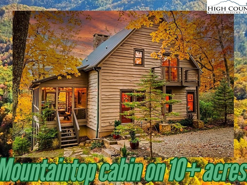 This beautiful 2BR 2BA mountain ridge-top cabin on 10+ acres offers a serene escape defined by nature and tranquility. The setting is ideal for those seeking a haven to unwind, connect with nature, and soak in the beauty of the mountain environment and views. Features include a sunlit open floor plan with a soaring ceiling, a dramatic wood-burning stone fireplace, hickory floors, and pine paneling. The kitchen has GE Profile appliances and a high-top bar. The loft works as a game area, office, or additional sleeping space. The primary suite offers woodland views and its own balcony. A wonderful bonus is the large deck and screened-in porch to enjoy and entertain all year round! The walkout basement/2-car garage has a laundry hookup, is plumbed for 3rd toilet, and can be finished for added living space; it includes a 30-amp RV outlet. This Property has sunrise/sunset views,