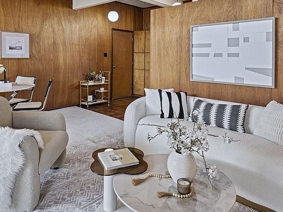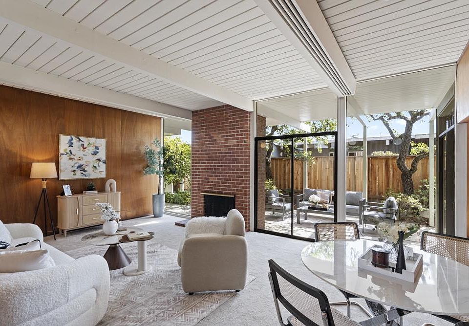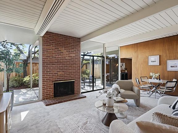 Mid-century charm meets everyday convenience in this 4-bedroom, 2-bath home in 19th Avenue Park neighborhood. A broad shade tree and post-and-beam facade introduce the home, with a side walkway leading to a quiet entry. A stained-glass sidelight, terracotta tile, and globe lighting overhead mark your arrival inside. The light-filled living and dining area features original wood paneling, fresh carpet, and a floor-to-ceiling glass wall framing rear patio views anchored by a red brick fireplace. The kitchen retains its original footprint with warm cabinetry, vintage lighting, and access to the two car garage with ample built-in storage. A flexible secondary living space could be used as a den, office, or media room. Multiple outdoor areas wrap around the home include distinct patio areas and additional outdoor space anchored by established landscaping. The private wing hosts a primary suite with patio access, dual closets, and ensuite bath, plus three addl bedrooms are served by a hall bath. Commuting is easy, just blocks from Hayward Park Caltrain and easy access to Highways 92, 101, and 280. Downtown San Mateo is less than a mile away, making this both a connected retreat and a rare opportunity to own a piece of iconic mid-century architecture in a central Peninsula location.