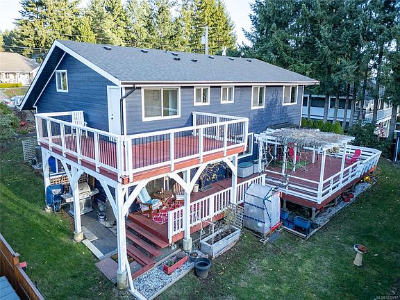 5 bedroom family home in quiet family neighborhood, 5 minute drive from North Island Hospital, NIC, Costco, Home Depot, Aquatic Centre, Crown Isle Shopping Centre, Mark Isfeld Secondary, & Valley View Elementary. Between the previous & current owners, lots of updates and upgrades: with vinyl windows, flooring--mostly laminate, with new carpet in family room--1 year old roof, kitchen & island counters recently replaced, appliances replaced, ensuite totally redone, some interior painting, exterior painted royal blue with white trim: great curb appeal. Recroom in the basement level just needs flooring to finish it off, perfect spot for the kids & all their friends to hang out. Family room off kitchen has a cozy gas fireplace, extra wide sliders onto a house-wide deck--half covered, half open--perfect for summer BBQ's & enjoying the mountain view. Primary bedroom has its own deck with commanding mountain views. Southern exposure with lots of windows make for a very bright & cheerful home.
