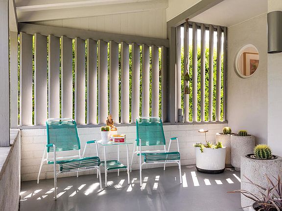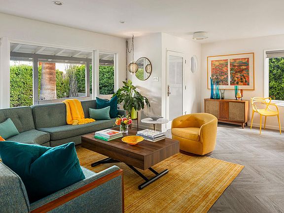 Streamline Moderne influenced post war Bungalow. c: 1946.Private gated and hedged courtyard garden leads to a wide covered front porch featuring a long band of horizontal glass, accented by a porthole window; hallmarks of this unique style of architecture inspired by ocean liners of the industrial age.The house is welcoming and bright, with sunshine streaming in to the handsome living room. There is a breakfast bar separating the the updated kitchen featuring a beautiful glass backsplash. The corner kitchen window at the kitchen sink offers stunning San Jacinto mountain views across the sparkling pool and spa. There are 2 graciously sized bedrooms and 2 updated bathrooms. Outside, the completely private hedged back yard is perfect for entertaining with abundant patio space for entertaining. This special home oozes vintage charm but features many modern updates, including owned solar with a Tesla battery wall and solar car charger. The foam roof is new (2021), along with a tankless hot water heater (2020) and an upgraded salt water pool with new pebble-tech finish, new waterline tile (2021). This stylish Warm Sands home sits on fee land in a very walkable part of South Palm Springs, with Townie Bagel, Rooster and the Pig the CV link and (coming in early 2026) the new Coffee Dose, all right around the corner.