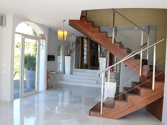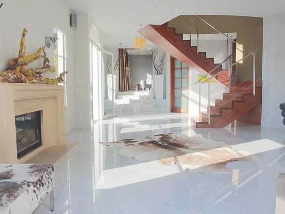 Inside, the home features a bright, open living area filled with natural light. Large windows and a contemporary fireplace create a comfortable main gathering space, while multiple seating areas allow for both everyday living and entertaining. The kitchen is thoughtfully designed with high-end appliances, modern finishes, and ample counter space, providing a functional layout for daily meals and hosting.