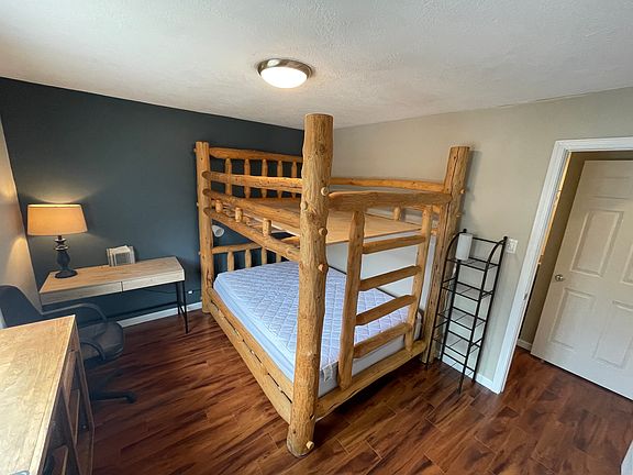 - Partially furnished, including: Sofa, King bed, Queen bunk bed, counter stools, coffee table, credenza, TV (bedroom), mini fridge, desk, chair, and dresser.