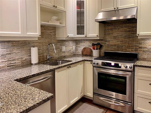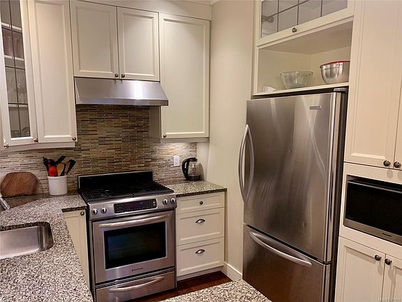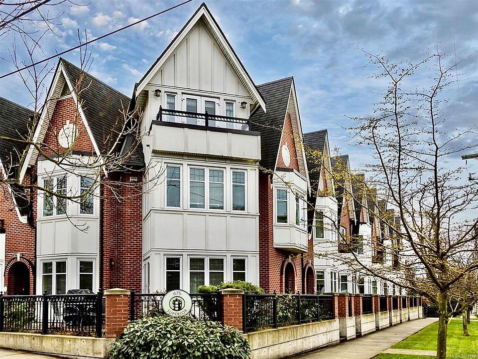 This elegant 3-bed, 2.5 bath brownstone-style townhouse offers almost 1800 sq/ft of refined living on 3 levels and is ideally positioned just steps from Beacon Hill Park, the Royal BC Museum, Parliament, and Inner Harbour. The main level showcases a gourmet kitchen with granite counters and stainless Kitchen Aid appliances, a gas range, breakfast bar, heated hardwood floors, an electric fireplace, and lovely east-facing views toward the park. French doors extend the living space onto an expansive patio with natural gas hookup for effortless outdoor cooking and entertaining. The second level includes two bright bedrooms with bay windows, a full bath, laundry, and a media room or office. The top level is dedicated to a generous primary suite, walk-in closet, Juliet balcony, and a spa-inspired ensuite with heated floors and oversized walk-in shower. This unit comes with 2 parking stalls, an EV charger and is the only unit in the complex with direct access to the secure underground garage.