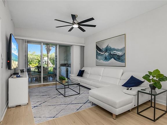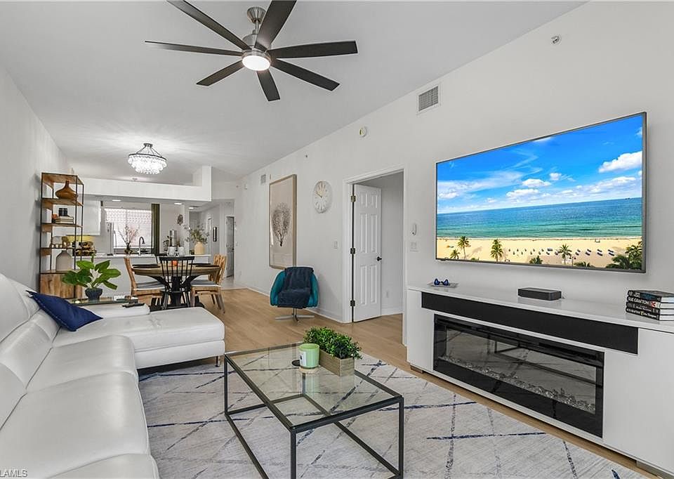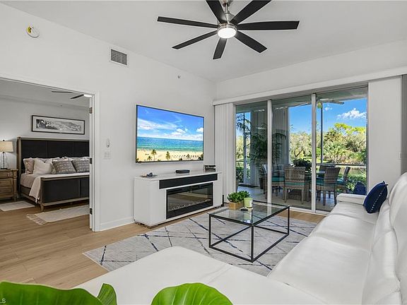 Stunning Turnkey Condo! Step into luxury with this completely renovated 2-bedroom, 2 - bath condo that perfectly blends modern elegance and coastal charm. Spacious living area that features electric fireplace, freshly painted neutral tones, luxury vinyl flooring that flows seamlessly throughout. Upgraded kitchen with modern cabinetry, Quartz counter tops, Designer finishing's, both bathrooms have been beautifully updated. Relax on your private lanai and take in the stunning water view & fountain, outdoor kitchen, storm shutters, 11 ft. ceilings, One car garage right outside your Condo. Enjoy a Resort lifestyle, amenities include Lazy River Pool, club house, lap pool, pickle ball, tennis courts, bike riding, walkways, many social events offered throughout the year. Centrally located close to Marco Island, Isle of Capri & Naples for your pleasure Beaches, Boutiques, Restaurant's & Entertainment. Full-time residence, vacation getaway, or investment property, this condo delivers the perfect blend of comfort, style & convenience in a resort setting.