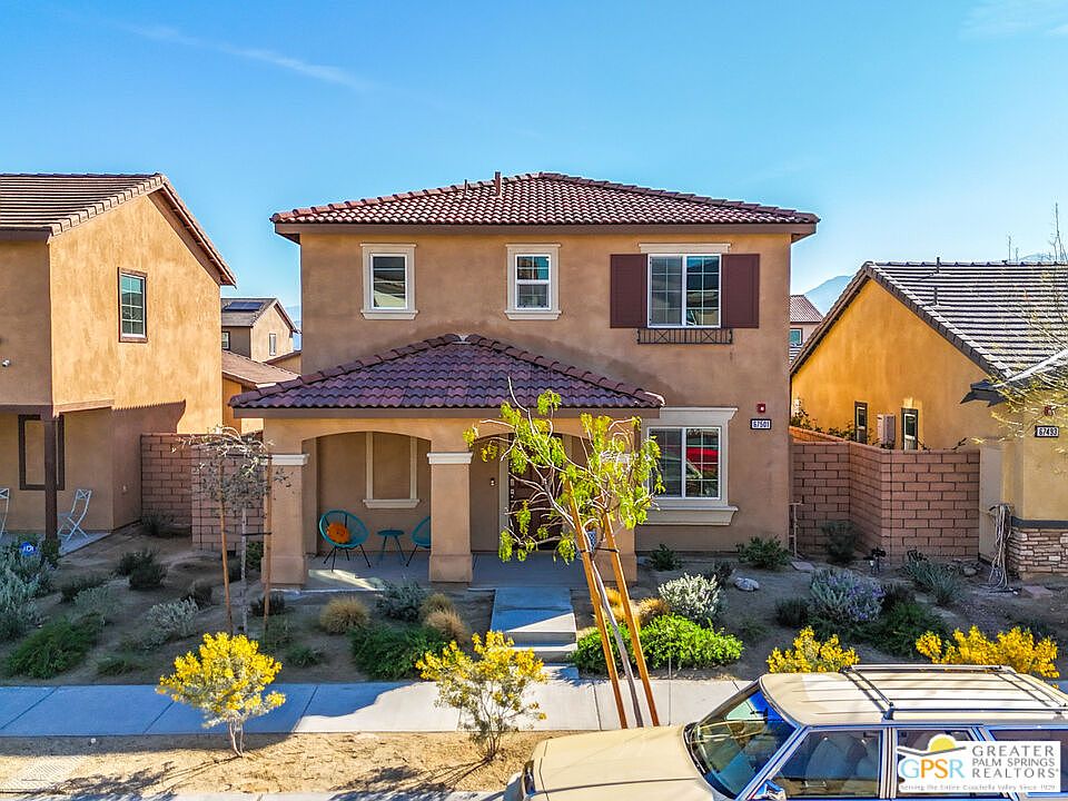Your new desert home awaits you in Verano! This 4 bedroom/3 bath home was built by DR Horton in 2021 and sparkles everywhere you look. You'll love the open floorplan, easy care wood-look flooring, a pretty front porch, bathrooms and bedrooms on both levels, stainless steel appliances in the sunny kitchen, mountain views, and a great backyard for entertaining. Highlights of this home are leased solar, beautiful desert landscape in your private backyard, smart home controls for HVAC, fully insulated and finished walls in the air conditioned detached two-car garage (perfect for a studio or workshop), custom roller blinds on every window- nearly $50,000 in upgrades completed by the current owner. Community amenities are a swimming pool, spa, clubhouse, tennis and pickleball courts, a fitness center, playground, and BBQ. Home has been virtually staged, buyer to verify HOA, solar agreement, square footage, and permits. Located on fee land that you own.