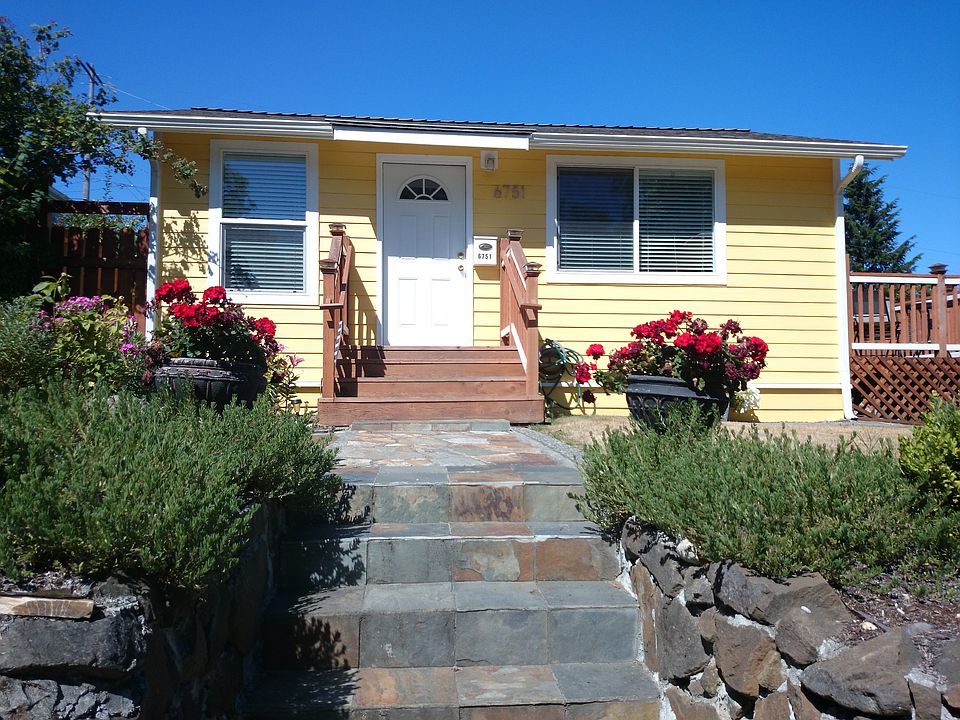 Live the cottage life in West Seattle. Front entry opens to spacious living room with city and territorial views and access to sunny deck. Updated kitchen includes granite tops and stainless appliances convenient to dining area with recessed lighting. Full ceramic tile bath. Large master bedroom with double closets, private 3/4 ceramic bath and sliders to deck and rear yard. Huge back yard with garden shed plus unfinished space that would make a great artist or exercise studio.