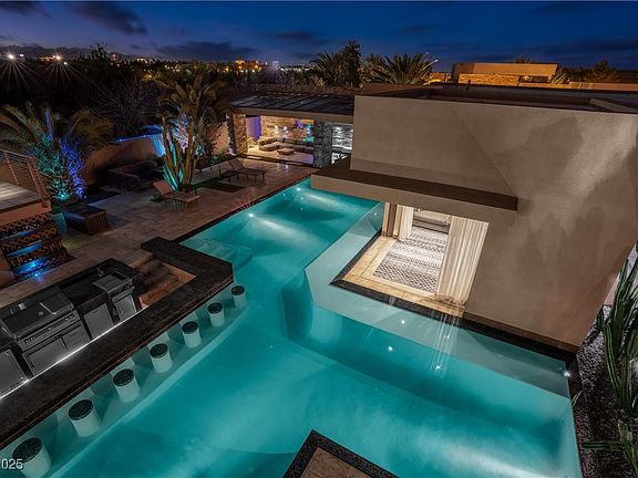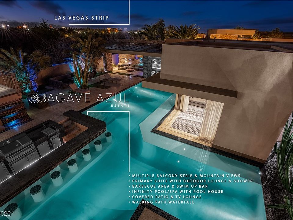 A rare opportunity to secure an award-winning 4-level Blue Heron “Modern Vegas” estate below market value. Minutes from the Strip on iconic Tomiyasu Lane in gated Marquis Las Vegas, this home delivers true luxury living. Fleetwood pocket doors open to a resort-style yard with vanishing-edge pool, swim-up bar, sunken BBQ kitchen, spa, fireplace, TV, waterfall, and lounge areas. The rooftop skydeck features a covered bar, fireplace, TV hookups, and 360° Strip/valley views. Inside: elevator, theater, loft bar/game room, smart tech, wine cellar, chef’s kitchen with Viking appliances, double ovens/fridges, butler’s pantry, hobby/laundry room, 4-car garage, and first-floor primary suite with wet bar and outdoor shower. An unbeatable value in one of Vegas’s most exclusive pockets. Contact listing agent directly to view.