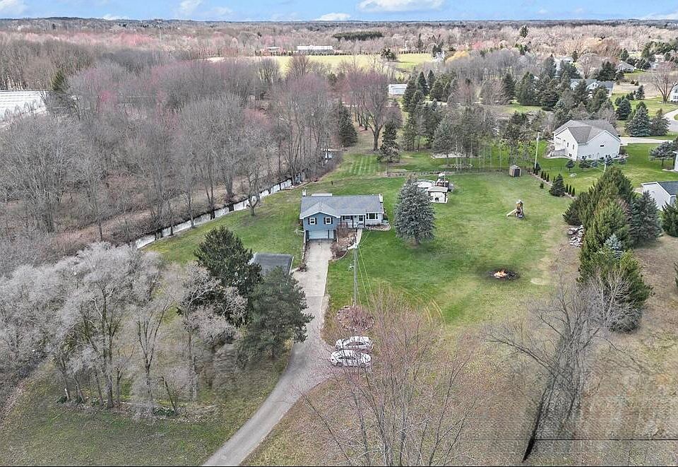 Best kept secret in Byron Center! Enter from the long, winding driveway leading to this private home set back alongside a creek. This remodeled ranch features 3 fireplaces, fresh paint, vinyl floors, huge kitchen with walk-in pantry, along with a new septic drain field, new water softener, new roof. Attached garage and outbuilding total 4 garage spaces. Enjoy the gorgeous 3 season room that faces the creek where you can see turkey, deer, and plenty of wildlife every day. Relax on the deck, in the hot tub, under the gazebo or in the pool. This property has it all; updates, design, nature, amenities, Byron Center school district, privacy and yet close to everything! Chicken coop stays, ask about the flock.