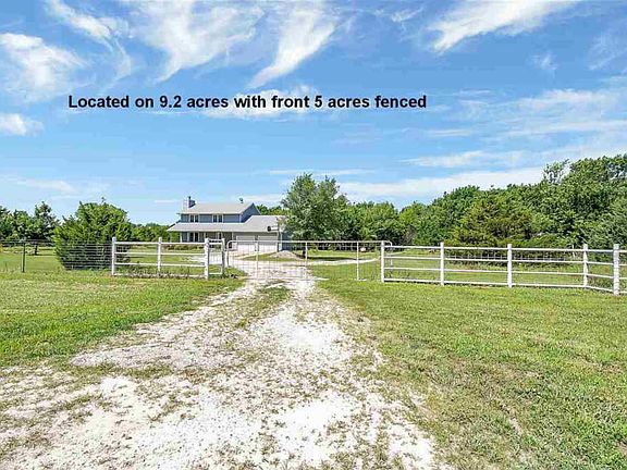 This 4 bedroom / 3 bath homes is located on 9.2 acres with a 40 x 65 outbuilding. Come visit this custom one owner home that has so much to offer. You will notice the front 5 acres is fully fenced with a gated entrance. Come on in and be greeted by the 13â2 x 6â9 foyer that allows plenty of room for family & friends to slip off their shoes. The 27 x 13â10 living room has space for a formal dining room table and features new hardwood flooring & wood fireplace. Everyone enjoys a large open kitchen for entertaining and this kitchen has it. Kitchen features a large island for meal prep or dining, walk-in pantry, double ovens and desk. All appliances remain with the home. Kitchen is open to the cozy hearth room with hardwood flooring & fireplace. You will also notice a 16 x 16 sunroom off the hearth room. There is a half bath located on the main floor for your convenience. Mosey upstairs and you will find 3 bedrooms & 2 full baths. Master bedroom suite is 15â8 x 14â5 with walk-in closet & private bath. Master bath features 2 sinks, jetted tub & separate shower. You will appreciate the laundry being located on 2nd level with bedrooms. There is a 4th bedroom in the partially finished basement along with a family room & rough-in bath. Take the path through the woods & find an amazing 40 x 65 outbuilding with 5 overhead doors. This building has enough room to fit all your play toys or hobbies. There is an office area that is heated & cooled along with a large loft for extra storage. Storage is no problem with all the other extra outbuildings. The property is very close to Augusta and has a El Dorado address, It is located within Bluestem school district. You might check to see if Augusta School District is still an open district.