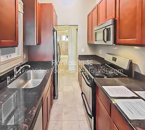 One large bedroom, and living room that is open to a galley kitchen. Stainless appliances: gas stove, dishwasher, microwave and refrigerator and granite counters with pretty wood cabinets. One updated full bath.