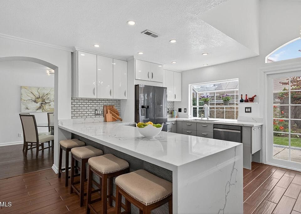 Contemporary kitchenLush landscaped backyardTranquil water featureSpa-like bathCustom cabinetryGenerous-sized closetOpen-concept first floor