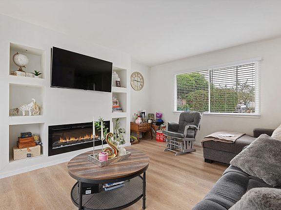 It's inviting layout showcases custom built-in's a sleek built-in electric fireplace that anchors the living space with warmth and character.