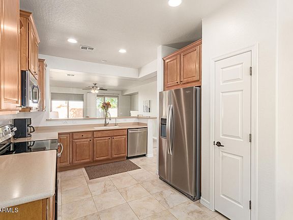 Presenting an adorable single story home in popular, gated Solera, a 55+ active adult community in the SE Valley! Pristine inside and out, the neutral palette is warm and welcoming throughout. Kitchen has all stainless steel appliances, handy pantry, bright recessed lighting, ample cabinetry, breakfast bar and cozy breakfast nook. Enter the primary bedroom, a peaceful retreat with direct backyard access, private bathroom with dual sinks and walk-in closet. Large backyard, complete with a covered, east-facing patio, perfect for relaxing with a book or entertaining friends and family. Come see all that this home and the community offers, including golf, pickleball, heated pool and spa, workout facilities, clubs and activities galore! Move-in ready and priced to sell!