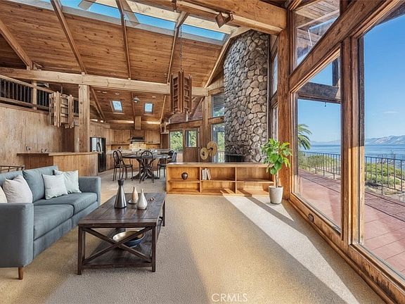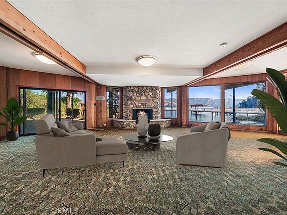 This one-of-a-kind lakefront home is an architectural gem, offering soaring vaulted ceilings with exposed wood beams, walls of windows, and multiple skylights that fill the home with natural light. A dramatic rock fireplace anchors both the main living area and the spacious downstairs family room, creating warmth and character throughout.