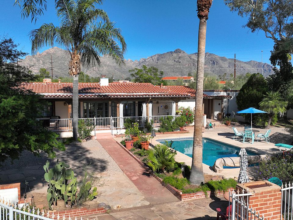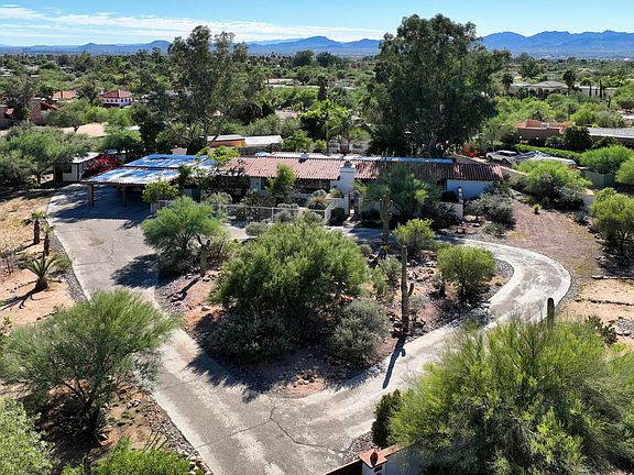 This beautiful southwestern home offers mountain views, vintage charm and plenty of character creating an incredible retreat in the sought-after Casas Adobes neighborhood! Lovely courtyard entry welcomes you inside where you'll find beautiful wood ceilings, 2 stunning fireplaces and a remodeled kitchen with hickory cabinets & SS appliances. The living room boasts a huge picture window framing the view. The family & dining areas open to the backyard through double French doors. Outside, entertain guests in the lush backyard w/pool, extended covered patio, BBQ/firepit and banco seating. Luxurious primary has sitting area, claw-foot tub and walk-in shower. Newer masonry wall surrounds the entire 1.25 acre property. 2-C Gar plus 2-Car caport and private gate round out the home.