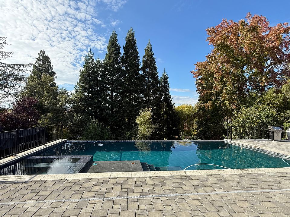Resort style outdoor retreat: Built in saltwater pool, adjacent hot tub, expansive high end paver patio for lounging or entertaining, and attractive landscaping with mature trees and plants.
