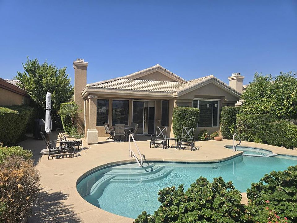 YOU OWN THE LAND! Welcome to your very own slice of paradise, where convenience meets comfort in a private retreat designed for relaxation and rejuvenation. Picture yourself lounging by the PRIVATE POOL and indulging in the SPA, both inviting you to unwind and soak up the sun in a tranquil setting. Each morning, you'll be greeted by BREATHTAKING SOUTHWEST MOUNTAIN VIEWS, as natural light flows through abundant windows, creating a warm and inviting atmosphere that feels like home. The LUSH LANDSCAPING surrounding the property enhances the serene ambiance, offering the perfect oasis to recharge your spirit. The SPACIOUS KITCHEN, complete with a delightful breakfast bar, stands ready to be the heart of your home. Dive into this realm of comfort and let this property become your new happy place. Includes working golf cart and whole-home humidifier system, and whole house speaker system.HOA DUES INCLUDE: 2 DVR or HD Cable boxes and service, High Speed Internet, grounds maintained to your door by HOA ground maintenance crew, outside pest control when requested, outside water, (you pay only for inside water). Gated community with 24 hour guard gate access, membership to Health and Fitness Center, Tennis, Bocce Ball, Pickleball. Discounts and preferred tee-times for owners at the Desert Princess 27-hole PGA Championship golf course, no initiation fees, rated among the best in the valley by GOLF DIGEST. This quiet community is away from the noise yet minutes from everything that is in Palm Springs; restaurants, shopping, casinos, an international airport, the Tramway, Art Museum, Theaters, and the Street Fair.
