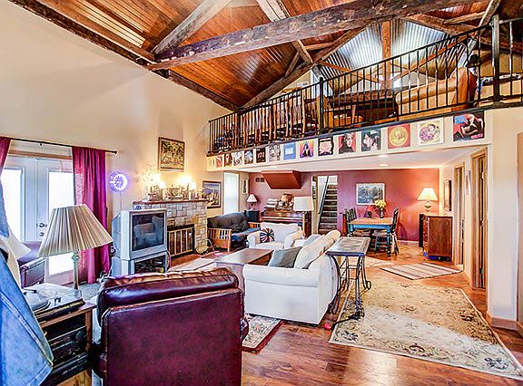 This stunning home filled with character was originally a church built in 1880. Open floorplan is highlighted by a dramatic cathedral ceiling featuring massive original wood beams and a spacious upper loft with iron railing that overlooks the main floor. Living room showcases a wood burning fireplace. Kitchen features stainless steel appliances, cherry cabinets, and a breakfast bar. Main floor also offers a bedroom, full bath and laundry. In addition to the loft, upstairs offers a second bedroom and an office/bonus room. Outside has a two-car detached garage, deck and mature landscaping.