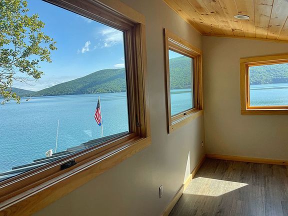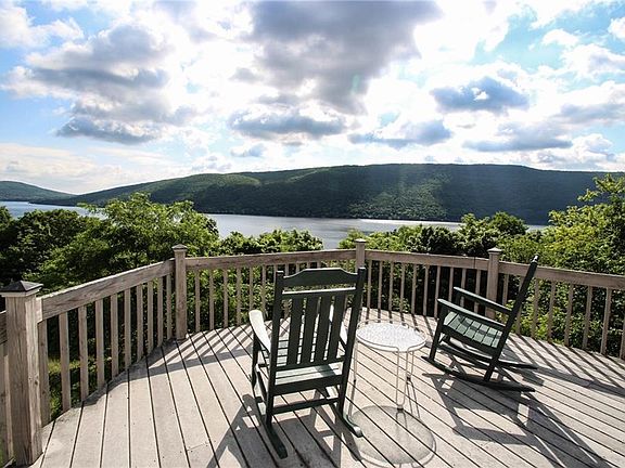 Rare Hershey Home on Canandaigua Lake - 620ft of lakefront privacy with almost 10 wooded acres includes a beautiful, spacious year-round contemporary home. Walls of windows offer stunning, unobstructed views!! Enjoy an open concept living/kitchen/dining area, perfect for entertaining. This SPACIOUS 4 bedrooms, 3 1/2 bath home boasts wonderful decks and stone patios, professional landscaping with meandering pathways lead to PICTURESQUE, private lake frontage with large permanent dock and 2021-built 750 sqft day cabin. Plenty of off street parking. Just 5 miles from Bristol Ski Resort! Enjoy your year round Lake home on the water during the summer and skiing at Bristol during the winter!