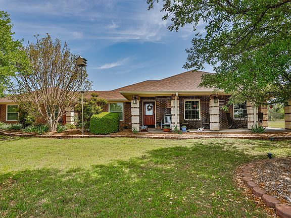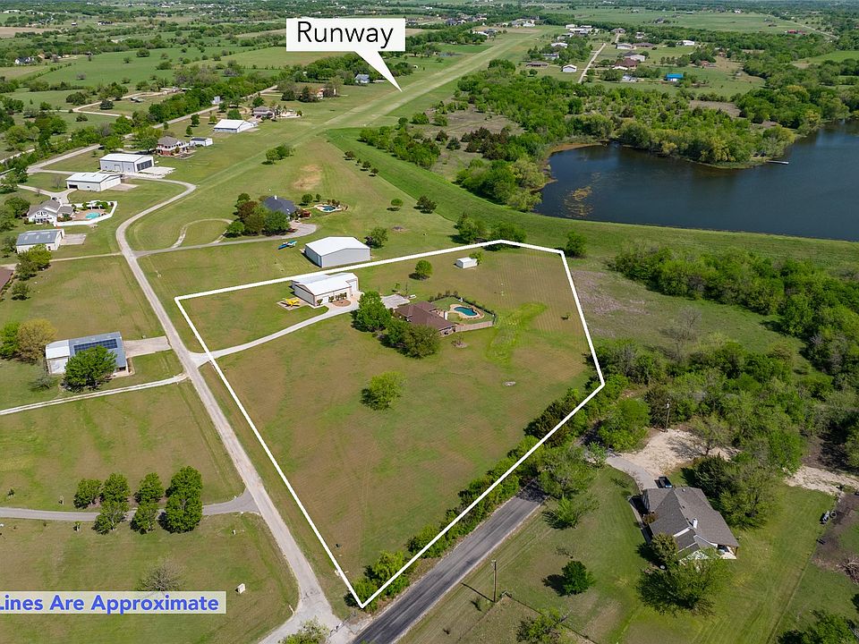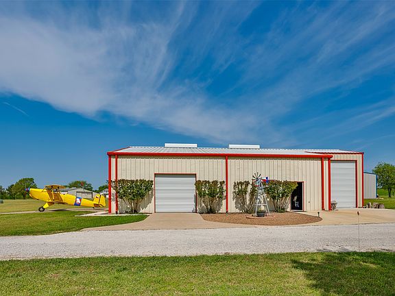 Welcome to Bar VK Air Ranch Estates, a community designed for aviation enthusiasts who value both adventure and tranquility. This pristine 4-acre property is a short walk from the runway and the lake, offering the perfect blend of convenience and natural beauty. The 2,000 sqf residence features an attached garage, sparkling pool, and a 50x48 hangar with additional workshop and RV storage. Surrounded by mature shade trees and Texas-hardy landscaping, the home invites you to relax and enjoy the outdoors. Inside, you’ll find an updated kitchen and bathrooms, along with 4 spacious bedrooms—including one that doubles as a second office with a built-in Murphy bed. A spacious separate utility room and organized kitchen with spice racks, blind corner organizer and soft close doors, make an efficiently running home. The home is equipped with both pellet stove and propane. Roof was replaced in 2024 with Class 4 shingles and Pella windows were installed in 2023, with a lifetime warranty. A pilot’s dream, the hangar boasts a 12x42 electric, cable-driven bifold door and 500 gallon fuel tank while the RV storage is equipped with 50Amp, 30Amp hookups and a septic drain. Beyond your property, the community comes alive with neighbors flying, cruising in golf carts, fishing at the lake, and taking in serene views. Conveniently located just 10 minutes from Sanger and under an hour from DFW International Airport, this property offers both seclusion and accessibility.