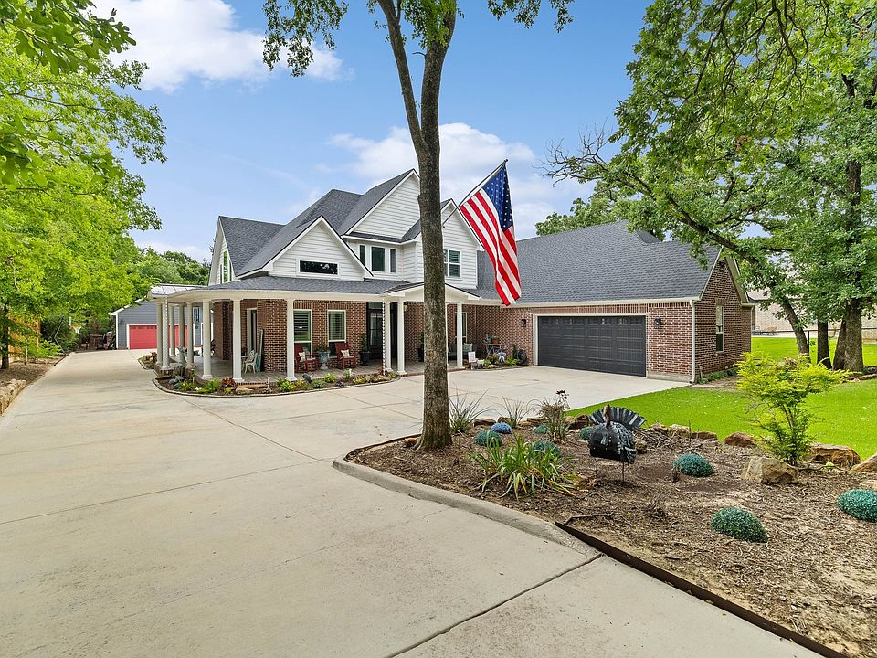 Country in the city! This custom modern farmhouse on a heavily wooded lot, gated driveway, LOTS of storage, open concept with latest conveniences & a 35,000 gallon saltwater diving pool & 2nd garage with workshop. The primary bath has 2 closets & 2 toilet rooms plus a large shower & clawfoot tub. An additional bedroom and full bath are also downstairs. Open concept great room, kitchen, dining with vaulted ceilings & walls of windows overlooking the wraparound porch. The kitchen is a dream! Oversized 13 x 6 island with storage & lots of seating. 6 burner cooktop & griddle with double oven, built in oversized fridge, quartz countertops, farm sink, pot filler & a 12 x 5 pantry. Oversized utility room with sink and wrap around desk. Large mudroom. Fully encapsulated spray foam GIANT 66 x 14 walk in attic. Tankless water heater, whole house water filtration & surge protection systems. Bring your farm animals and enjoy the simple life while less than 5 mins to great shopping and dining.