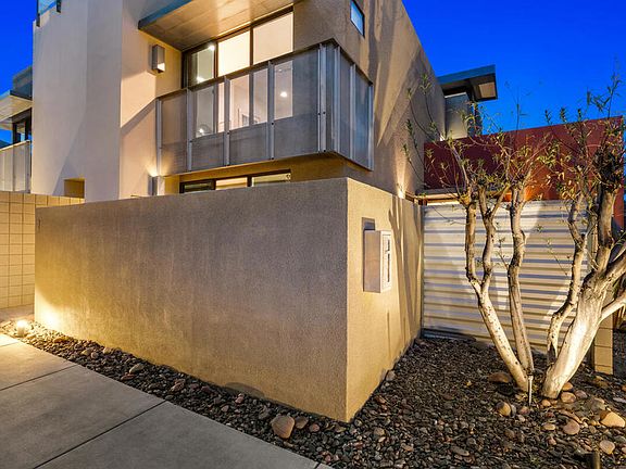 Introducing 677 East Arenas, a rarely available corner unit located in the sought-after 48 @ Arenas community. This contemporary condominium has refined modern finishes, and a premier downtown address. Owners benefit from Fee Simple land (MEANING YOU OWN THE LAND!), along with access to four well-maintained community pools and spas, all within minutes to Palm Springs' renowned dining, shopping, and entertainment destinations. The residence features an open floor plan with polished concrete flooring that extends into a kitchen equipped with sleek cabinetry, granite countertops, and stainless-steel appliances. The thoughtfully designed living area includes high ceilings, a gas fireplace, and direct access to outdoor patios, enhancing the indoor-outdoor living experience. The main level also offers a powder room, in-unit laundry, and direct access to two spacious, covered parking spaces. A floating wood staircase leads to the upper floor, where there are dual primary bedroom suites. One of the bedroom suites is appointed with tall ceilings and clerestory windows for ample natural light. The second bedroom suite, which is also en suite, is generously sized and bright. Both bedroom suites are complemented with modern closet organizers. The property's low HOA fee encompasses earthquake insurance, water, trash service, and exterior and roof maintenance. This condo delivers modern design, an exceptional location, and resort-style amenities in central Palm Springs. Please contact us today for a private showing!
