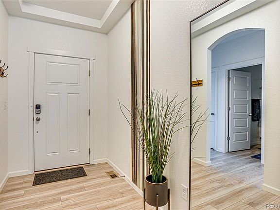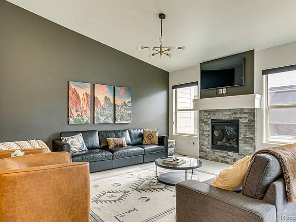 Welcome to this stunning, move-in-ready 3-bed, 3-bath modern home, offering high-end upgrades and the option to be purchased fully furnished for an effortless transition. Designed for both comfort and style, the bright and open great room is an entertainer’s dream, featuring soaring vaulted ceilings, a sleek fireplace, and a spacious dining area, all centered around an upgraded kitchen with a large island that overlooks the living space. Designer light fixtures, premium tile, custom window treatments, and elegant paint choices create a warm, inviting atmosphere filled with natural light. The 1,525-square-foot main level is thoughtfully designed for convenience and privacy. The primary suite boasts expansive windows, a walk-in closet, and a luxurious ensuite with a double vanity. A secondary bedroom sits at the front of the home with an adjacent full bath, while a dedicated office space, a walk-in pantry, and a well-appointed laundry room with ample storage add to the home’s functionality. The attached two-car garage provides additional convenience and storage options. Built in 2022 by Cardel, this 3,050-square-foot home also features a finished basement that expands your living space with a stylish speakeasy-inspired entertainment area, complete with an upgraded wet bar kitchenette, granite countertops, custom wallpaper, and designer lighting. An additional bedroom and full bath make it perfect for guests or extended stays. Enjoy the ease of low-maintenance living with a metro district-maintained greenbelt. Located in the desirable Lincoln Creek Village, this home offers a perfect blend of modern elegance and turnkey convenience. The fully furnished option includes mounted TVs, window coverings, bedding, kitchen and bath essentials, and all furnishings—negotiable to suit your needs. Move in without lifting a finger and start living your best life in this beautifully curated home.