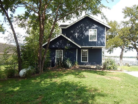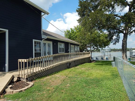 Beautiful waterfront home on Eagle Mountain Lake. Home has had many upgrades including: granite in kitchen, new very large decked porch, new exterior paint, new central heat/air, chain link fence, new gas range, spray foam in attic and underneath house. This house is being offered fully furnished. Master has french doors that open to the deck with lovely lake views, two separate closets and it's own bath. Second bedroom has two sets of bunk beds. Third bedroom is upstairs with another bunk bed and a 1/2 bath. Storage shed included. Storage underneath porch. Very large yard with plenty of room for parking, boats, rvs, or any additions you might want. Double decker dock with Trex on decking and walkway. Dock contains a boat lift, a storage closet, a second level, and 2 electric sea doo lifts. This property is exceptional with very large trees for shade and the wonderful water views.