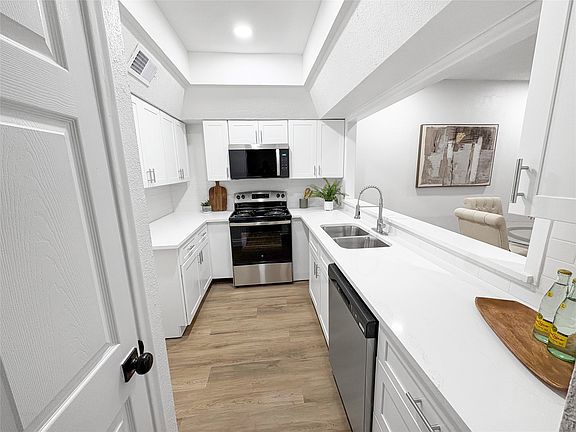 Beautifully renovated townhouse in Town North with modern updates and a flexible layout! Brand-new kitchen appliances, new countertops, flooring, and paint throughout. The downstairs suite can serve as a 4th bedroom, office, or media room—it has no windows for added privacy, plus an ensuite bath and walk-in closet. Upstairs features 3 bedrooms, including a primary suite with standalone tub & updated shower, plus a loft perfect for study or play. It also has your own private balcony upstairs. Enjoy a cozy living room with fireplace, private terrace with mature trees and swing, 2-car garage, newer AC units, and community pool. Located in a quiet community with direct access to the SoPac Trail and White Rock Lake, just minutes from shopping, dining, and Lakewood Elementary!