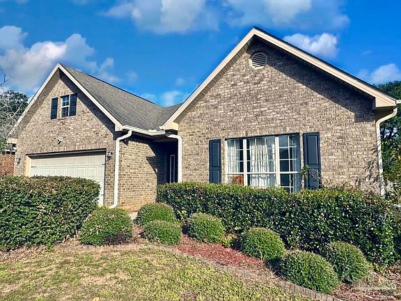 Welcome Home to this gorgeous all brick home in Rustic Ridge! This spacious split plan has ceiling heights from 9' - 13' giving a wonderful open feel! The living room features a vaulted ceiling and newly installed custom electric fireplace for those cozy nights. It is open to the kitchen, complete with hop up bar and dining area. Step into the kitchen & notice the staggered Espresso cabinets with crown molding, brushed nickle pulls and a modern glass tile backsplash! It is a chef's dream with the deep stainless steel double sink with retractable faucet & disposal, large pantry, and lots of recessed lighting. The dining area is spacious and will accommodate a large table & buffet. Step into the spacious main suite at the back of the home & enjoy a large walk-in closet and sitting area. Double windows provide lots of natural light to this space! The master bathroom features a comfort height double vanity, separate shower, garden tub, linen closet and tile flooring. The 2 additional bedrooms are at the front of the home, with the second bath also on this side of the home. Additional features include a 10 X 15 covered lanai, 6' privacy fence, and gutters. Rustic Ridge is just minutes to Whiting Field, medical facilities & major shopping. Short drive to beaches.