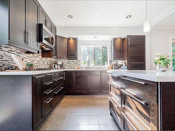 Sunshine Hills. Perfect Rectangular lot (66x120), wide front good for duplex. No Trees on the property. Across from park and Tennis Court. 3 level split family home with huge family room including wood burning fireplace, dark wood floors opens to kitchen with espresso cabinets, stone countertop, pantry drawers, undermount sink, stainless steel appliances, gas cooktop, 2 built-in-ovens and large island. One more bedroom with gas fireplace can be used as separate living room. 3 bedrooms up with 2 full baths. Private yard, day care just across the street and beautiful park just steps away. School catchments are Sunshine Hills Elementary and Seaquam Secondary.