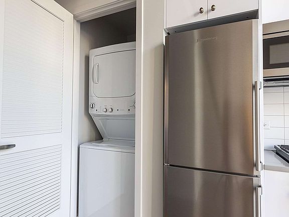 In-unit washer and dryerSpa-inspired glass-enclosed rain showerCustom cabinetryStylish subway tile backsplash
