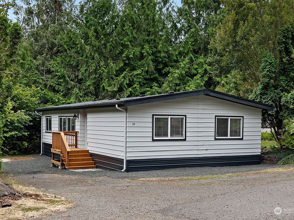This beautifully remodeled 3-bedroom, 2-bath double-wide home is located in the highly sought-after Robin Hood Village, an all-age community nestled in a serene forested area above the Robin Hood Resort on Hood Canal. The extensive renovation features new flooring, interior/exterior paint, windows, kitchen, stainless steel appliances, bathrooms, baseboard heating, siding, drywall, plumbing, deck, and a new roof. This unit offers ample parking and exceptional privacy. The area is a haven for outdoor enthusiasts, with activities like sightseeing, kayaking, hiking, golfing, oyster picking, crabbing, clamming, fishing, and more. Lot rent is $625 per month. Welcome home!
