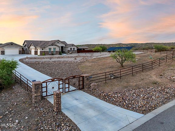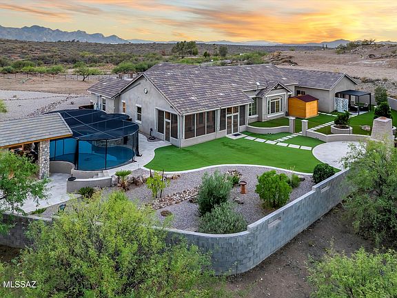 This property has everything you could imagine, want, or need! Spacious 4-bed, 3-bath home with separate casita for guests, plus 5 garage spaces on 1.28 fenced acres. Newly installed solar panels with 2 storage batteries are owned outright! Property borders state land and has mountain views, along with a gorgeous saltwater pool/spa/swim-up bar, cabana, outdoor kitchen, attached AZ room, roll up awnings, outdoor fireplace with easy care landscape and artificial turf. Located south of Oracle in the foothills of the Catalina Mountains, in the gated / firewise community of Copper Hills Estates, with fire hydrants throughout. At a 4100 ft elevation, you will love the serene setting of this home: enjoy privacy, cooler summers/mild winters, wildlife, hiking and horseback trails, nights filled with dark skies and endless stars - just 20 minutes from Oro Valley! The home boasts 14+ foot ceilings with an open floor plan and freshly painted interior. The kitchen features a large island, maple-glazed soft close cabinets, granite counters, and premium stainless appliances/double oven. Main home and guest casita each have separate laundry facilities. Seller will remove screened enclosure around outdoor pool/spa upon request.