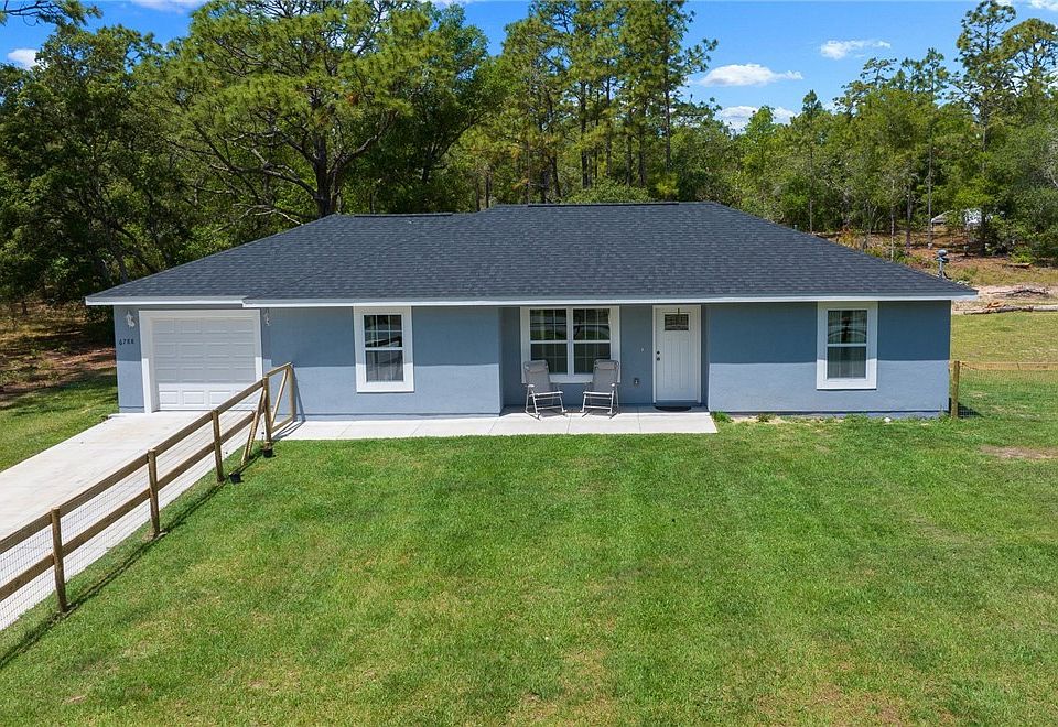Discover the perfect blend of modern comfort and peaceful seclusion in this brand-new, move-in ready 3-bedroom, 2-bath home nestled on nearly 1 acre. Just a short drive from Ocala, this home offers the ideal balance of privacy and convenience. Step inside to a thoughtfully designed open floor plan with contemporary finishes, spacious living areas, and plenty of natural light. The stylish kitchen features sleek cabinetry and stainless-steel appliances. The primary bedroom has a walk-in closet and a master bath, while the additional bedrooms are generously sized for guests, family, or a home office. Explore the outdoors! This quiet retreat offers a paved road for bike riding, and a quick 2 minute drive from the Goethe State Forrest for hiking and Rainbow River for paddling! It takes 6-8 minutes to get to the grocery stores and shops, or take HWY 40 straight to the World Equestrian Center and the Paddock Mall!