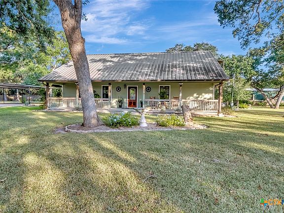 This perfectly sized, peaceful, country oasis in Edna is exactly what you have been looking for! Well-built & beautifully laid out, this home is designed for happy, easy living! Spectacular front & back porches greet you as you arrive & drift freely into the open concept living/dining/kitchen that is the true heart of this happy home! Wide open, this area is perfect for both entertaining the entire family or for cozy nights in! Custom features abound from the custom antler light fixtures to the beautiful woodwork & beyond the pride of ownership shines in this one! There is even a planned place to add a woodburning fireplace if you need a place to hang your stockings! The center island kitchen features abundant custom wood cabinetry, a cheerful window over this sink, a nearly new range & a clever refrigerator nook making efficient use of every inch of space. The flex/laundry room offers the perfect drop zone space for a busy family & features a well thought out half bath! The primary bedroom is roomy & spacious with a wonderful closet. The secondary downstairs bedroom is comfortably sized with an ample closet. The oversized bathroom features both a stand-up shower & a relaxing soaking tub! This clever layout also has a third bedroom upstairs accessible from the outside that could also easily pivot to an office, a place to run an onsite business, a theater room, an additional living room, hobby room or whatever you can dream up! As if all of this was not enough, the outside here is a true extension of the living space! The huge porches, stunning landscape, leafy shade canopy provided by the mature trees, pretty pond complete with a stunning cypress tree, chicken coop and/or animal run, storage building with a great covered area are just a few of the features of this wide-open space waiting for you here! The durable metal roof will ensure years of peaceful easy enjoyment. Let's make your country living dreams come true in this affordable home!