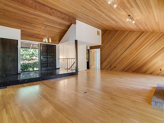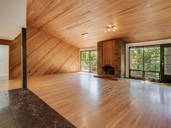 Step inside to a dramatic and open living room featuring gorgeous hardwood flooring, a vaulted wood-grain ceiling, and a striking brick fireplace surrounded by tall windows that flood the space with natural light. A door from the living room leads out to a large balcony overlooking the treetopsperfect for morning coffee or evening relaxation.