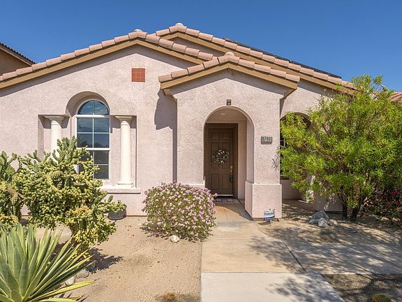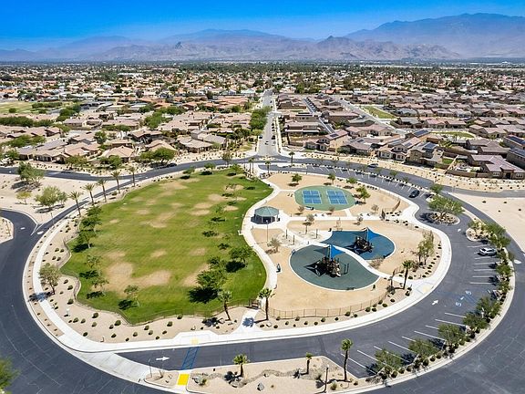 Verano's best value for this 3 bedroom, 3 full-bath residence. Dual Masters! Move in ready! New interior paint. Previous model home. Solar included! Crown molding accents, updated flooring throughout with no carpet. Remodeled primary bathroom with large walk-in shower. ADA toilets in primary and guest bath. Updated AC less than 5 years. New patio cover with a nice sized patio area. Large kitchen/family room with center island. Stainless appliances. Verano features wonderful amenities including a clubhouse, community pool, spa, pickle ball, tennis, park, greenbelt, playground area. Close to shopping centers, roughly 5 miles to the Palm Springs International Airport and convenient access to the 10 FWY. Refrigerator included.