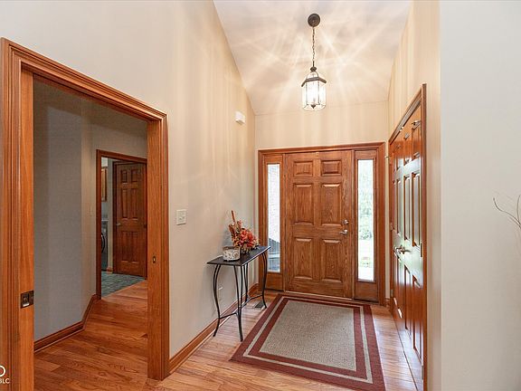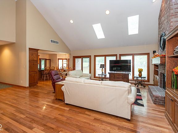 Beautiful Custom all brick ranch nestled in the woods and backing up to 912 Acres of Atterbury Fish & Wildlife land! Private drive leads you to this hidden paradise. Great room is huge with raised ceiling & a gas fireplace flanked by built-in bookshelves. Solid honey oak flooring throughout the home & Pella Windows w/Blt-in blinds give you the custom home feel. Kitchen has tons of cabinets, new over & microwave and tons of counter space. And down miss the 8x5 walk-In Pantry. Primary suite with vaulted ceiling and fireplace. Primary bathroom is large & has jetted tub & large walk-in shower & skylight. Primary walk-in closet has access to the laundry room. Front bedroom would also make great office. The other 2 bedrooms & full bath are on the other side of the house. Sun room has 2 full walls of windows to enjoy the beautiful setting or to observe the wildlife. Exterior has a wonderful, stamped patio with a Royal Spa hot tub (included)and a built-in Grill with a hard-line gas line. Home has a 26x24 attached garage with a 16x6 separate storage area (new garage door 2023) and then a 36x24 Detached garage. The northside of the property butts up to a private pond. Improvements: HVAC 2019 Evolution System, Exterior paint 2023, Wtr. Htr 5yr, Wtr. Softener 7yr, all recessed lights are LED. Enjoy the peace and quiet of nature from your backyard where deer roam on the property as your backyard neighbor is the Atterbury wildlife area. This home has built with no transitions on the flooring and 36" doors for handicap accessibility as well.
