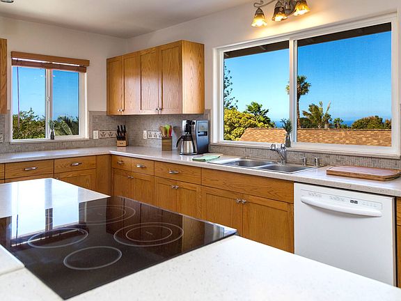 Approach this home along the palm lined drive. It sits on an elevated lot which allows for privacy and lovely views to the ocean beyond. The upper level boasts an open living concept with 2 bedrooms and 2 full baths, each with a dual vanity and easy access walk-in showers. The master suite has a huge walk-thru closet too! The open concept kitchen has a NEW counter top cook top, Corian counters, a walk-in pantry and a large picture window that frames the ocean view and Haleakala. There are custom built-ins in the dining area and living room and bamboo flooring runs throughout except for the wet areas(tile). From the living room you can access the covered lanai and all of the West facing windows allow a view to the ocean. New cordless blinds have been installed in the living room, kitchen, and 2nd bedroom. There is a new washer and dryer in the pristine 2 car garage.The lower level of this home has a large bedroom with walk-in closet, a large bathroom, and a living room/family room with a wet bar. There are new window treatments throughout and plenty of storage may be found in the closet under the stairs! It can be accessed by an interior stairwell or by it's own entrance from the outside. There is a small covered lanai with slider on the lower level. The entire house has a central vac system. There is additional storage under the house that is easily accessible and secure. The low maintenance yard has various fruit trees including banana, mango, pomello, orange and other citrus all on recently updated drip irrigation system! Some furnishings included / all furnishings negotiable. Seller is offering a 1 year Home Warranty!