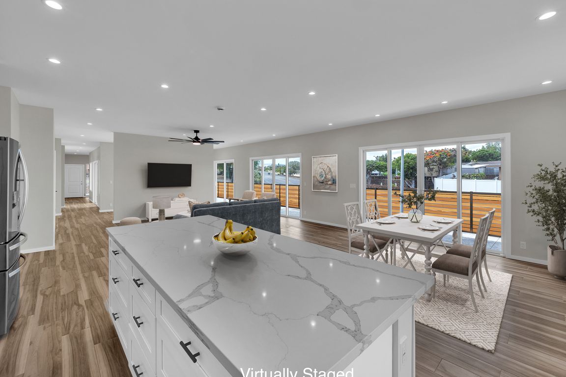 Partial ocean viewsSpacious side yardCement drivewayLarge two car garageSleek matte black hardwareLarge windowsNeutral tones